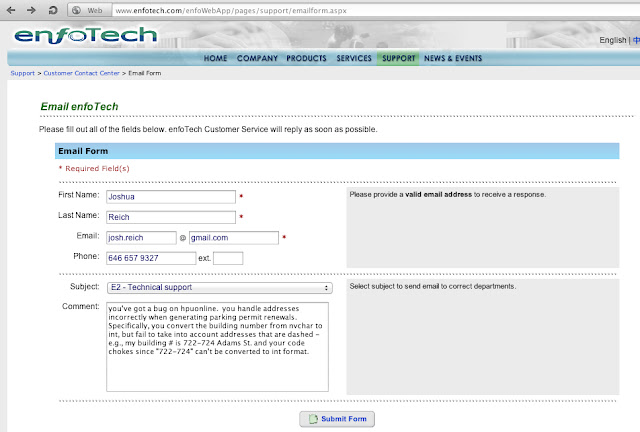 Of course, once one is on this ill-designed interface, one quickly discovers that there is no help functionality or email address listed! So, looking at the copyright, I see that the website is run by the previously mentioned enfoTech. Apparently, this outfit provides all sorts of software services to local governments - from (mis)managing waste-disposal to parking permits. So I go to their online web form to fill out a trouble ticket.